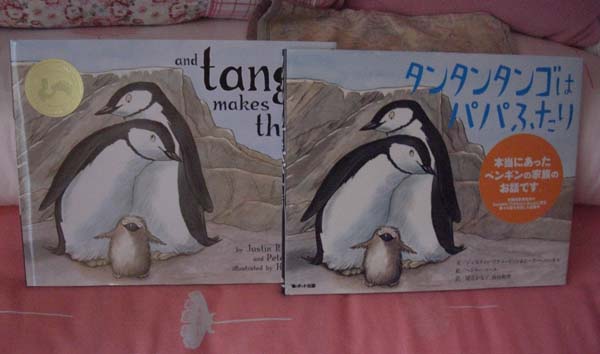 原書名是《and tango makes three》,日文翻譯版的名字是《探探探戈有兩個爸爸》~=v=~果然還是日文標題基情指數高呀!!!+v+ 這本繪本是根據紐約市中央公園裏面一對BL企鵝Roy和Silo的真實故事改編滴~~圖畫雖然簡單,但是看起來好舒服呀~從兩隻的相識、約會、筑愛巢、把小石頭當蛋來孵,直到動物園管理人看出了它們的基情,靈機一動給了它們一顆真蛋來孵~兩隻企鵝廢寢忘食地交替孵蛋,終於迎來了女兒Tango的誕生> <,從此一家三口過上了無憂無慮的生活(誤)!!!多美好的基情故事!!!!這是《紐約紐約》的企鵝版麼!!!姐姐內牛滿面呀 TVT