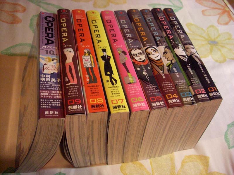 近期敗家物之二:好多的OPERA。其中有少部份是新書,大部份是二手。不過日本腐女的愛書程度非常值得我學習借鑒= = 因為這裡面的新書舊書是分不出來的,唯一的分辨方法就是看贈品還在不在。通過書脊可以觀察到幾個有趣的地方:1. 1-5期的封面是basso,6-10的是中村明日美子;2. 從第7期開始,中村的名字排到basso前面了;3.從第10期開始,沒有了外封+里封的組合,扉頁也被刪去了。其中我最喜歡第7期的封面呀 XDD 黑得好有feel~而且最令我意外的是,這本二手居然還有明信片 T。T 連第6期的明信片也一併夾在裏面了。。。內牛滿面呀>0<~~~~